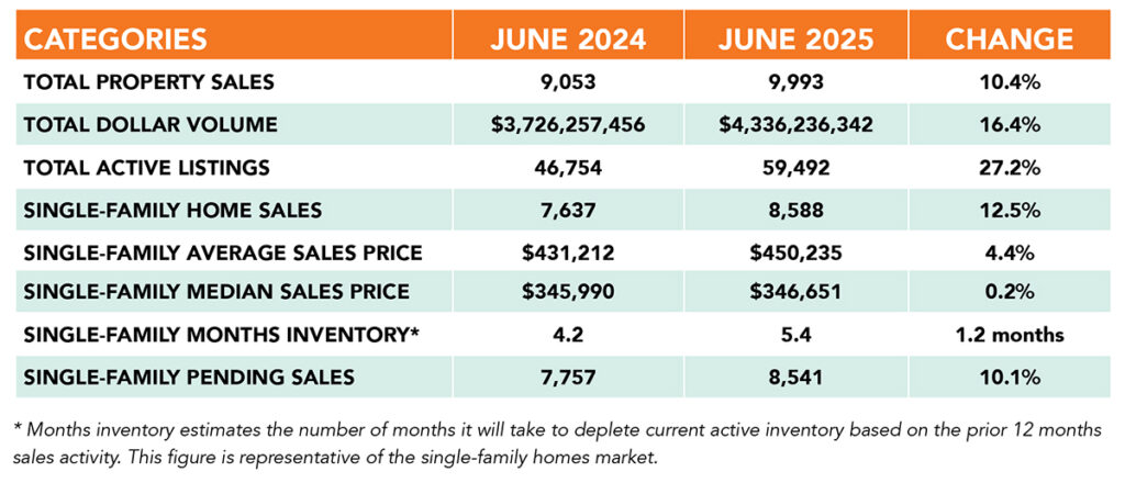 The average sales price rose 4.4% to $450,235 versus $431,212 in June 2024. The median home price was up marginally, at $346,661 versus last June’s $345,990.